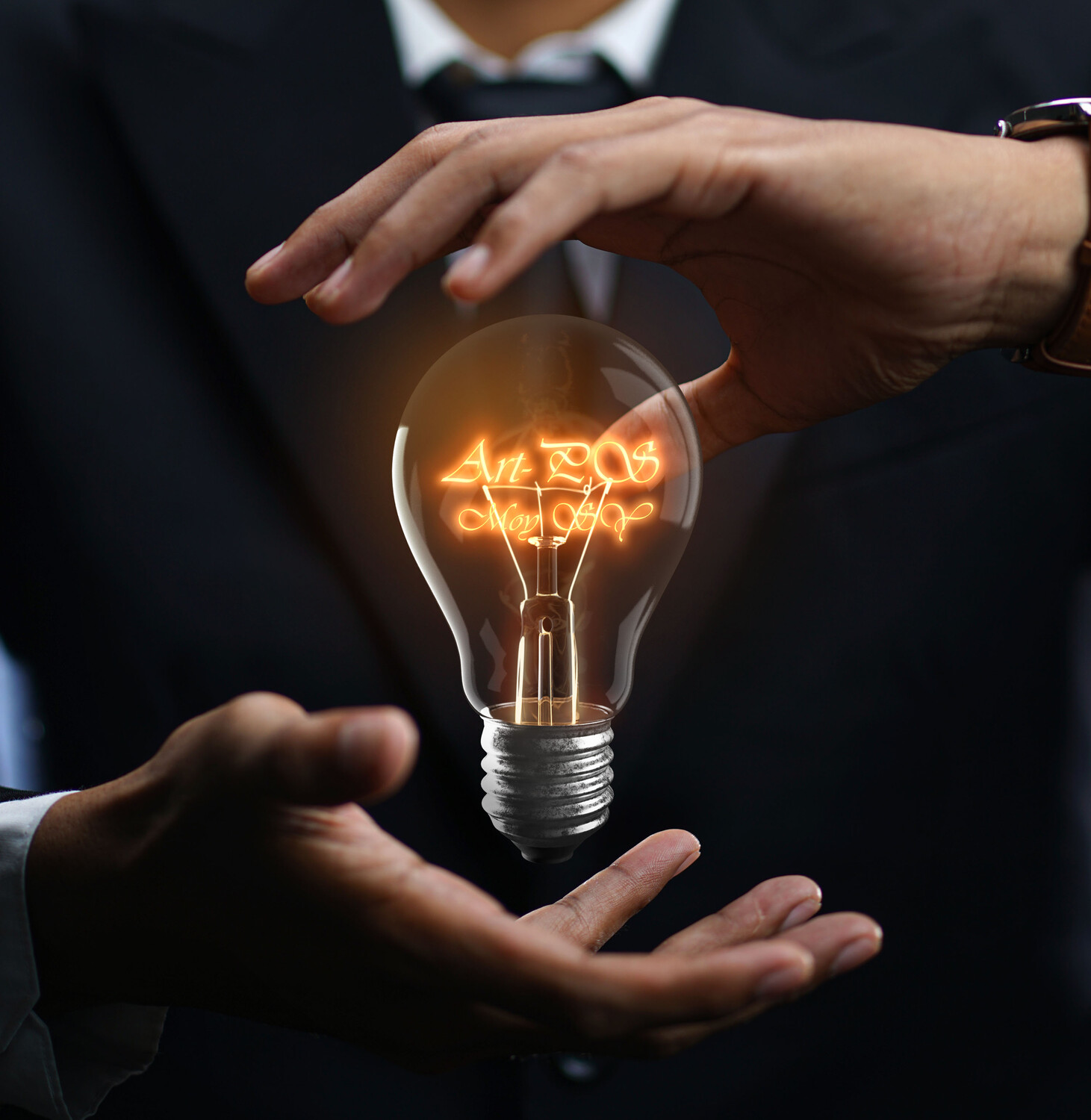 Реалистичный PSD-шаблон для эффектной демонстрации логотипов, текста или концепций стартапа внутри классической лампочки накаливания. Снимок крупным планом: руки в д...